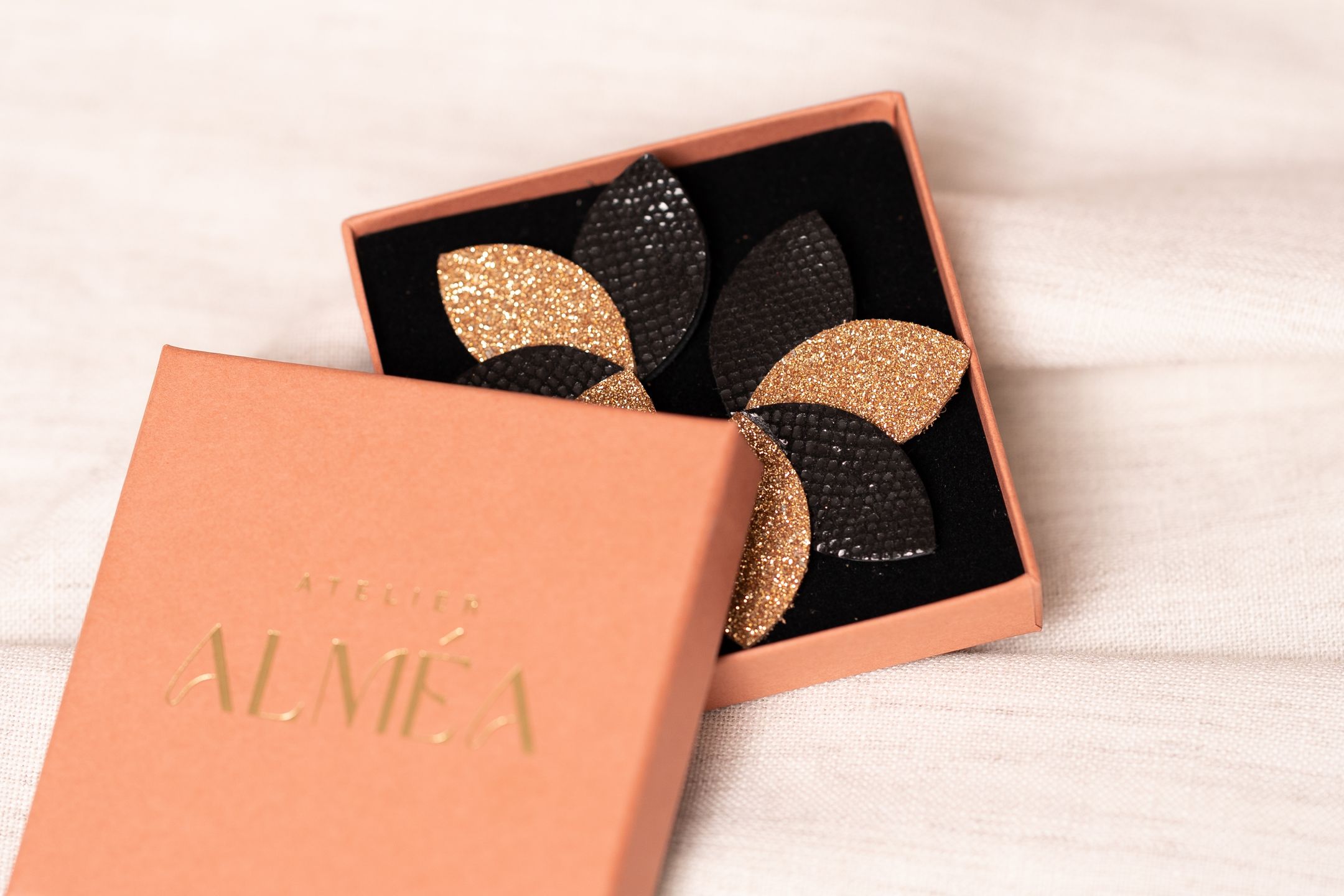 Chaque paire de boucles d’oreilles est entièrement fabriquée à partir de pétales de cuir façonnés à la main. Ce modèle représente une demi-fleur qui vient délicatement épouser la ligne du visage, apportant une touche élégante et originale à votre style.