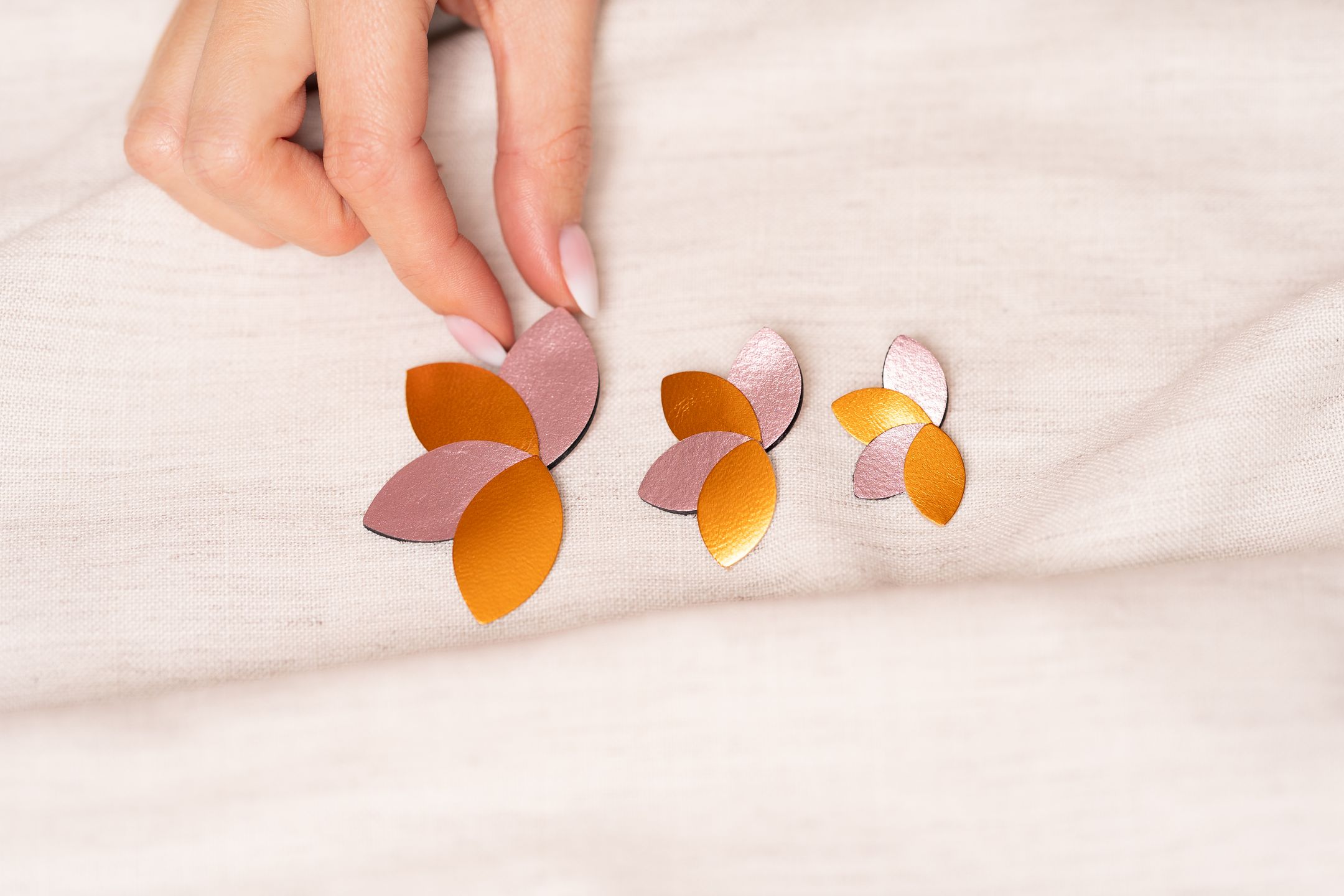 Chaque paire de boucles d’oreilles est entièrement fabriquée à partir de pétales de cuir façonnés à la main. Ce modèle représente une demi-fleur qui vient délicatement épouser la ligne du visage, apportant une touche élégante et originale à votre style.