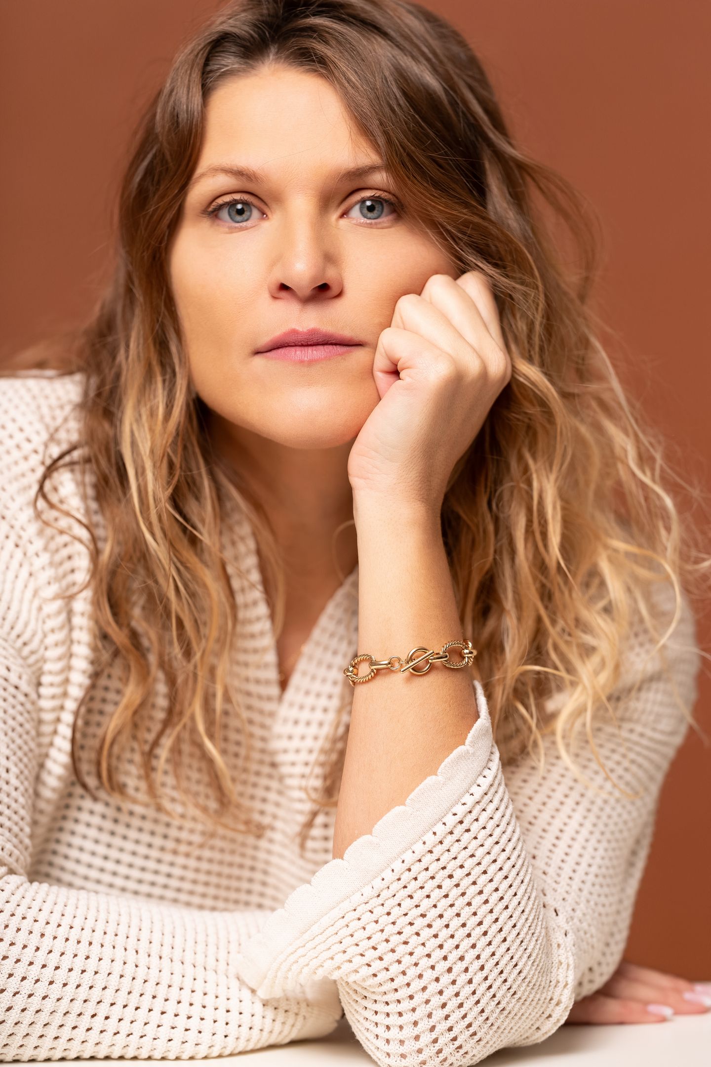 Sa structure non ajustée lui permet de tomber légèrement sur le poignet, créant un mouvement chic et décontracté. Chaque maillon reflète la lumière avec subtilité, apportant une touche de sophistication à n’importe quelle tenue.